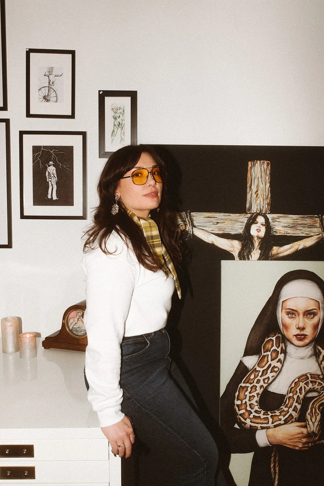 Drawing from feminist literature, Catholic iconography, mythological archetypes, and contemporary media, Weber builds compositions that reflect both personal experience and broader societal narratives, punctuated by a keen, incisive wit.